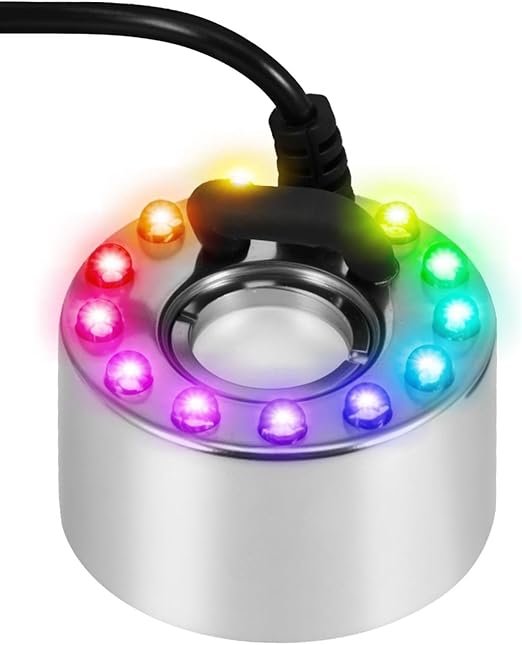 - Iluminación: 12 luces LED que cambian de color, iluminando la niebla (rojo, verde, azul, etc.).